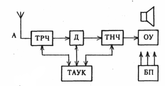 Рис. 3.4. Обобщённая структурная схема, отражающая основные функции радиоприёмного устройства: А — антенна; ТРЧ — тракт радиочастот; Д — детектор; ТНЧ — тракт модулирующей (низкой) частоты; ТАУК — тракт адаптации, управления и контроля за работой радиоприёмного устройства; ОУ — оконечное устройство; БП — блок питания.