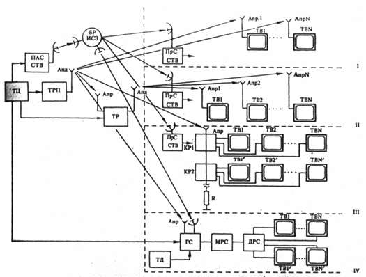 Рис. 3.12. Структура сети ТВ-вещания: передающая часть (слева); варианты I — IV приёмной (справа).
