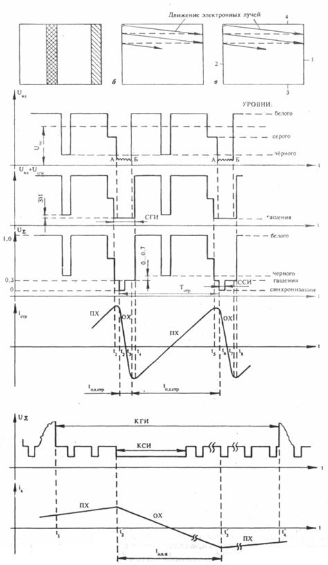 Рассмотрим осциллограммы сигналов на выходах отдельных блоков телецентра (рис. 3.13, а) при передаче изображения в виде тонких черной и серой вертикальных полос на белом фоне (рис. 3.14, а). Отклонение электронного луча по фотокатоду в передающей трубке (рис. 3.14, б) и по экрану кинескопа в телевизоре (рис. 3.14, в) производится одновременно по 2 осям и обеспечивается пилообразными колебаниями строчной (рис. 3.14, ж) и кадровой (рис. 3.14, и) развёрток. Если при передаче белого (чёрного) изображения образуется максимальный (минимальный) сигнал (рис. 3.14, г), его полярность считается положительной. Во время обратного хода электронного луча передающей трубки сигнал изображения не образуется, так как трубка закрыта гасящими импульсами (участки А — Б на рис. 3.13, г; незначительные изменения напряжения в это время обусловлены шумами трубки — флуктуациями темнового тока). Образующийся на выходе передающей трубки сигнал изображения с уровнем 10—20 мВ характеризуется тем, что он однополярен, то есть содержит постоянную