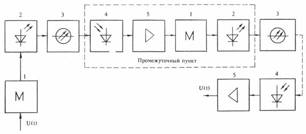 Рис. 3.27. Структурная схема волоконно-оптической системы передачи сигналов: 1 — модулятор; 2 — оптический генератор; 3 — оптическое волокно; 4 — фотоприёмник; 5 — усилитель.