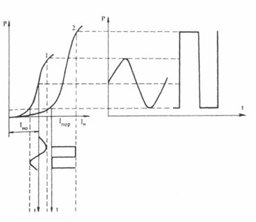 Рис. 3.29. Изменение интенсивности оптического излучения при различных видах ватт-амперной характеристики и токах накачки.
