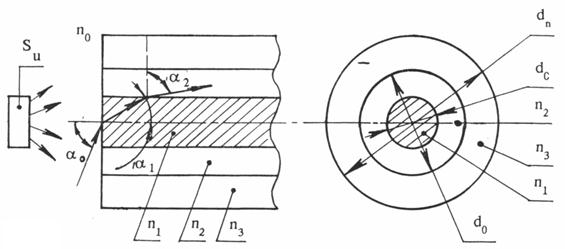 Процесс распространения оптического излучения по ВОЛС рассмотрим на примере трёхслойного оптического волокна (ОВ; 3.30) внутренний слой которого — сердечник — имеет диаметр