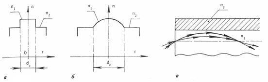 Рис. 3.32. Изменение показателя преломления оптического волокна со ступенчатым (а) и градиентным (б) переходами и ход лучей в градиентном оптическом волокне (в).