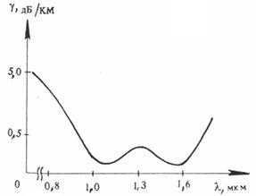 Рис. 3.33. Зависимость километрического затухания оптического волокна от длины волны