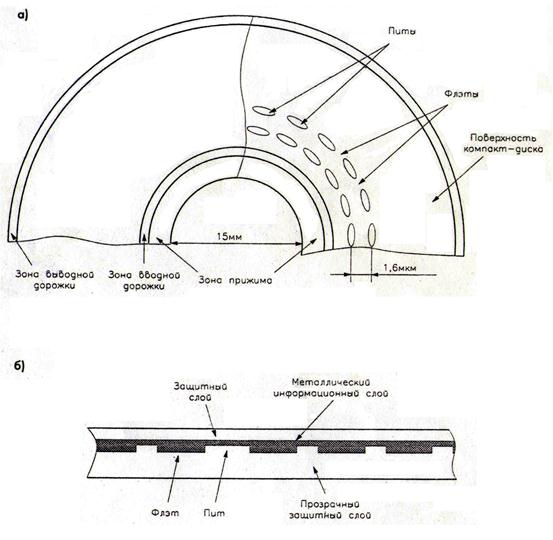 В середине диска (рис. 4.9а) находятся отверстие диаметром 15 мм и зона прижима диаметром 33 мм вокруг него, необходимые для установки диска в устройство привода. Информационная поверхность компакт-диска располагается между зонами вводной (нулевой) дорожки диаметром 46-50 мм и выводной (внешней) дорожки диаметром 116-117 мм.