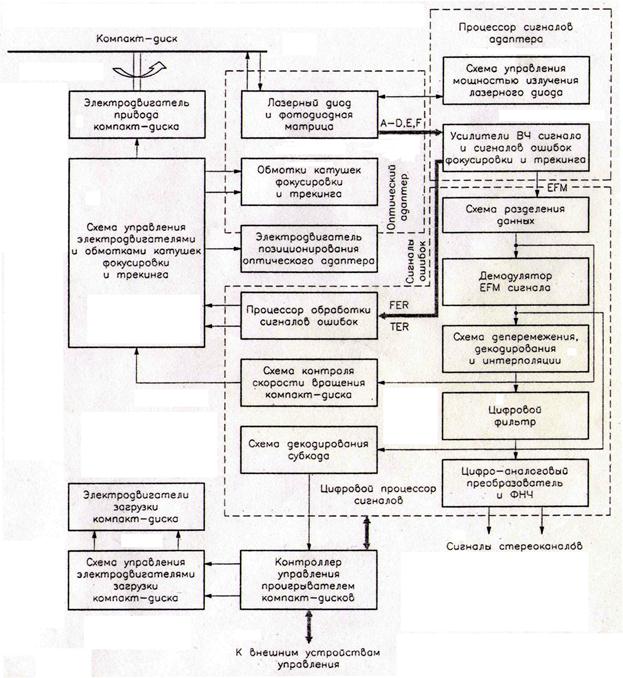 В зависимости от модели проигрывателя реализация тех или иных узлов и программ обработки при воспроизведении информации бывает различной, но общая структура неизменно сохраняется. Обобщенная структурная схема проигрывателя компакт-дисков (рис.4.21 включает в себя устройства, осуществляющие: