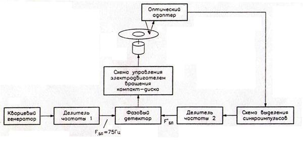 Возможно использование разных алгоритмов подстройки скорости вращения диска. Наибольшее распространение получили цифровые схемы на основе системы фазовой автоподстройки частоты, а также схемы, использующие буферную память - ОЗУ. В первом случае с помощью фазового детектора производится сравнение высокостабильной эталонной последовательности импульсов частотой FБЛ = 75 Гц (частота блоков) с последовательностью блоковых импульсов F'БЛ считанных с компакт-диска (рис. 4.2.2 При рассогласовании по частоте того или иного знака фазовый детектор формирует сигнал ошибки, управляющий скоростью вращения электродвигателя привода диска.
