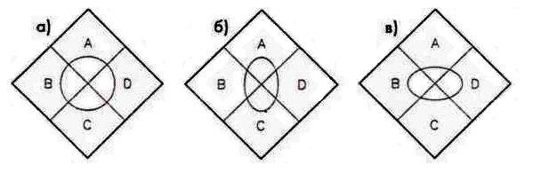 В процессе воспроизведения с помощью схем сложения и вычитания (рис. 4.13) формируется и анализируется напряжение ошибки фокусировки FER = (А + С) - (В + D), которое зависит от формы пятна отраженного луча. При этом используется оптическое свойство астигматизма лазерного пучка. В идеальном случае при форме пятна в виде круга (рис. 4.23а), когда расстояние между объективом адаптера и поверхностью компакт-диска соответствует требуемому, напряжение ошибки равно нулю. При изменении этого расстояния круг трансформируется в эллипсы разного вида (рис. 4.23б,в), и напряжение FER отклоняется от нуля в ту или иную сторону. Из данного напряжения после коррекции и усиления формируется управляющий сигнал FE, воздействующий на обмотку катушки фокусировки оптического адаптера и перемещающий линзу до получения минимальной величины ошибки.