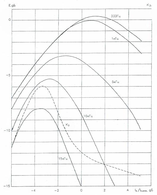 Рис.4.27.Зависимость коэффициента третьей гармоники и ЭДС оттока подмагничивания воспроизводящей головки