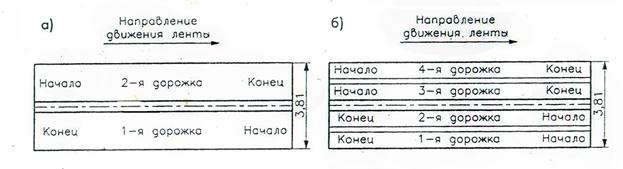 Рис 4.28 Размещение дорожек записи на ленте кассетного магнитофона: а – монофонического,