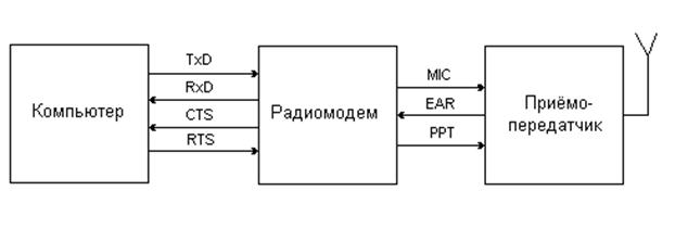 Перед передачей кадра контроллер включает модем с помощью сигнала по линии РТТ, а по линии TxD посылает кадр в коде NRZ-I. Модем модулирует получаемую последовательность в соответствии с принятым способом модуляции. Промодулированный сигнал с выхода модулятора поступает на микрофонный вход М1С передатчика.