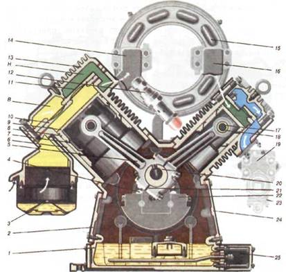 Устройство: 1-корпус; 2, 24-крышки; 3-воздухоочиститель; 4-подшипник; 5-шатун; 6-ЦНД; 7- маслосъемные кольца; 8-компрессионные кольца; 9-поршень ЦНД; 10,11-клапанные плиты; 12-предохранительный клапан; 13- клапанная коробка; 14,16-трубы; 15-холодильник; 17-поршневой палец; 18-бронзовая втулка; 20- коленчатый вал; 21- прокладки; 23-регулировочный клапан. Рабочий цикл (рис.2.)(всасывание и нагнетание) осуществляется за один оборот коленчатого вала. При движении поршня 9 вниз в ЦНД6образуется разрежение. Вследствие этого открывается всасывающий клапан и наружный воздух, проходя через воздухоочиститель 3,заполняет полость над поршнем. При движении поршня вверх всасывающий клапан закрывается, воздух в цилиндре сжимается до 3,5 кгс/см2, открывает нагнетательный клапан и по трубе 14,снабженной предохранительным клапаном 12,поступает в холодильник 15. Из холодильника воздух по трубе 16через всасывающий клапан второй ступени поступает в ЦВД, где сжимается до 9 кгс/см2, а затем через нагнетательный и обратный клапаны подается в ГР.