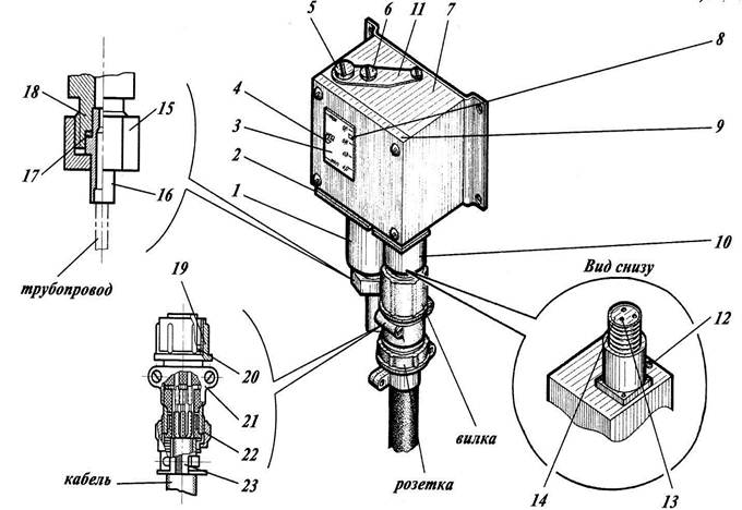 1 - корпус; 2 - прокладка; 3 - шкалы; 4 - указатель возврата; 5 - винт зоны возврата; 6 - винт диапазона; 7 - стенка корпуса; 8 - указатель уставки; 9 - лицевая панель; 10 - штепсель; 11 - планка; 12 - винт заземления; 13 - контакты; 14 - изолирующая пластина; 15 - гайка; 16 - ниппель; 17, 20 - прокладка; 18 - штуцер; 19 - гайка; 21 - розетка; 22 - гайка; 23 - прижим.