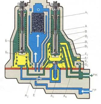 Работа: Воздух из ГР поступает в камеру А, затем через фильтр 6по каналам A1 и А2— под выключающий клапан 2,а по каналу А3— под обратный клапан 13. В это время камера Бканалами Б1 Б2, В3и В1соединена с камерой В,которая в свою очередь каналом В2сообщена с АТ. После подъема клапана 2произойдет следующее: воздух из ГР по каналам А1и А2поступит в канал Еи далее под клапан 14, пружина которого отрегулирована на давление 7,5 кгс/см2; клапан 14поднимется и закроет канал В1, прекратив сообщение камер Б и В; обратный клапан 13откроется, и воздух из ГРпо каналу А3 через отверстия Е1 и Е2 поступит в канал А4 и далее по каналуРК — к разгрузочным клапанам компрессора; по каналам Б2 и Б1, воздух поступает в камеру Б, клапан 2закроется и разобщит каналы А2и Е. После закрывания клапана 2 воздух из ГР поступает к разгрузочным клапанам компрессора только через каналы A 1, A 3клапан 13и канал А4. При давлении воздуха в ГР 7,5 кгс/см2 клапан 14 переместится вниз и посадит обратный клапан 13на седло 11. Тогда канал А3 перекроется клапаном 13,сообщение ГР (канал A1)с каналом А2и разгрузочными клапанами прекратится, камера Бканалами Б1, Б2, В3и В1сообщится с камерой Вис АТ.