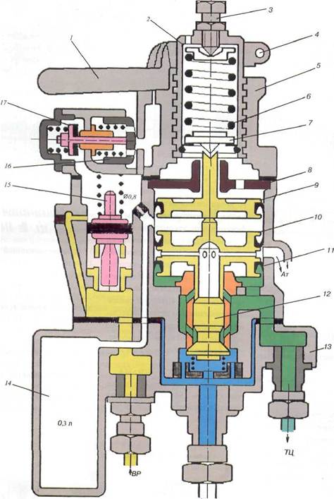 В привалочной плите 13 расположена дополнительная камера объемом 0,3 л и штуцеры для подключения трубопроводов от ГР, ВР и ТЦ.