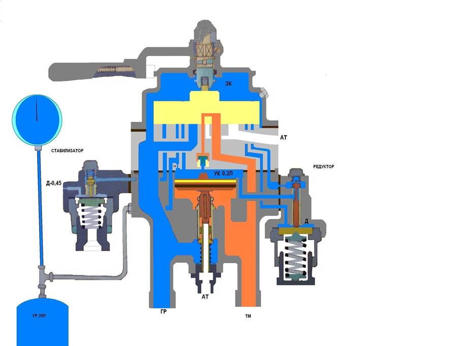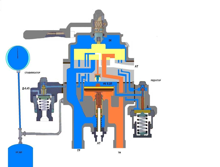 автоматическое поддержание зарядного давления. После ликвидации сверхзарядки, стабилизатор продолжает выпускать воздух постоянно из УР,УК и камеры Д редуктора, как только давление в камере Д станет менее чем усилие нижней пружины, то пружина прогибает диафрагму вверх открывая клапан и воздух из ЗК через отв. 3 мм в золотнике и открытый клапан редуктора поступает в УК и в УР, камеру Д. Как только давление в камере Д превысит давление нижней пружины, диафрагма прогнется вниз, а клапан редуктора закрывается. Таким образом стабилизатор постоянно создает утечку, а редуктор её пополняет и за счет этого давление в УР, УК, Д автоматическм поддерживается равным усилию пружины редуктора. Автоматическая ликвидация сверх зарядного давления. УР и полость над УП через выемку золотника постоянно сообщена с АТ через отверстие диаметром 0,45 мм в крышке стабилизатора и открытый возбудительный клапан. Темпом мягкости ликвидируется сверхзарядное давление из УР, УК, камеры Д. Как только давление в УК станет немного меньше чем в ТМ, под давлением ТМ УП поднимется вверх открывая АТ отверстие через которое ТМ сообщается с АТ и разряжается темпом мягкости Пружина стабилизатора регулируется на такое усилие, чтобы возбудительный клапан был бы открыт даже при максимально возможном сверхзарядном давлении. Темп снижение менее 80 с. ослабить пружину стабилизатора. Питание утечек в ТМ. Давление под УП менее чем в УК, УП вниз перекроет АТ, разобщит ТМ с АТ. В ТМ утечки, УП вниз откроет впускной клапан-сообщит ГР с ТМ