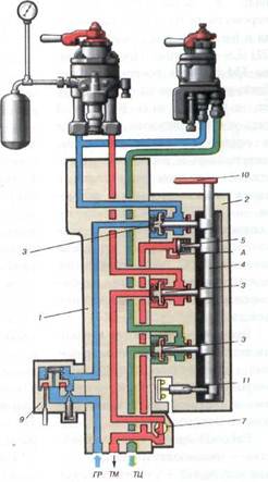 В действующей кабине локомотива ручка 8 комбинированного крана расположена вертикально, а ручка 10 (рис.14) повернута вниз до упора. При этом эксцентриковый вал 4 принудительно открывает клапаны 3 и запирается в этом положении хвостовиком поршня 5. Если ручка 10 не занимает вертикального положения, то хвостовик поршня 5 не войдет в паз вала 4 и воздух будет выходить в отверстие Л, сигнализируя о неправильном положении ручки. Воздух из ГР через сигнализатор расхода воздуха и верхний клапан 3 поступает к 395 и к крану 254. Через 395, средний клапан 3 и комбинированный кран воздух проходит в ТМ. Одновременно воздух из ТМ проходит под блокировочный поршень 5, который своим хвостовиком запирает (блокирует) эксцентриковый вал 4. При нижнем (включенном) положении ручки блокировки электрический контактор замыкается под действием своей пружины. При смене кабины управления надо в оставляемой кабине перевести ручку крана машиниста в 6-е положение, кран 254 в последнее тормозное положение с давлением в ТЦ 3,8-4,0 кгс/см2. После разрядки ТМ до нуля повернуть ручку блокировки вверх на 180° и снять ее с квадрата вала. При смене кабины управления надо в оставляемой кабине перевести ручку крана машиниста в 6-е положение с давлением в ТЦ 3,8-4,0 кгс/см2. После разрядке ТМ до нуля повернуть ручку блокировки вверх на 180° и снять ее с квадрата вала. Клапаны 3 под усилием пружин упираются в седла, прекращая сообщение ГР и ТМ с краном машиниста, а крана 254 с ТЦ. Одновременно кулачок вала толкателем 11 размыкает контакты электрической цепи управления локомотивом.