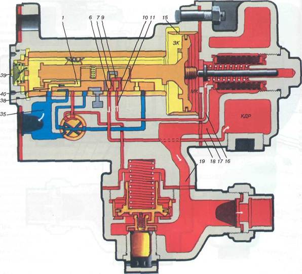 Одновременно воздух из магистрали отжимает поршень ускорителя с пружиной,через отверстие 20диаметром 0,8 мм заполняет полость над УПи каналом 22 и 33, выемке 32через переключательную пробку подходит под главный золотник. ТЦ сообщается с АТ каналом 35, отверстием 28, выемкой 29, отверстием 31 и каналами 2, 3 и 4.Камера дополнительной разрядки КДР — через главныйи отсекательный золотники с АТ каналами 18, 6, 7, 9, 5, 4. Медленная разрядка тормоза (темпом мягкости с 5 до 4,5 кгс/см2 за 75 с и более) происходит за счет сообщения ЗР с магистралью через отверстия 15.