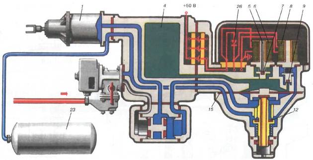 Перекрыша. (рис.29.) По достижении в РК 4 и в ТЦ 1 требуемого давления изменяем полярность — тока, «-» подключается на рабочий провод, «+» — на корпус. При такой полярности ток не проходит в катушку ТВ 8, этому препятствует селен 26. В результате якорь вентиля 8 (ТВ) отпадает, клапан 9 закрывается и разобщает камеру 4, а также полость над диафрагмой 15 с ЗР 23. Катушка же ОВ 6, возбуждена, якорь ее притянут и АТ канал 5 закрыт клапаном 7. Благодаря этому в камере РК (4) устанавливается постоянное давление. Давление же в ТЦ продолжает повышаться, так как клапан 12 открыт, как только давление в полости под диафрагмой 15, а следовательно, и в ТЦ сравняется с давлением в камере РК (4), диафрагма 15, выпрямляясь, переходит в среднее положение. Клапан 12 под действием пружины закрывается и прекращает дальнейшее поступление воздуха из ЗР 23 в ТЦ. Таким образом устанавливается положение перекрыши.