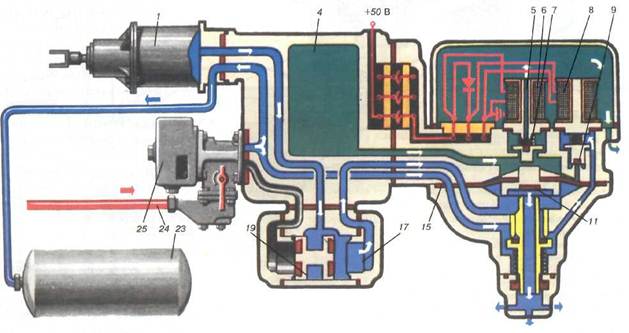 Отпуск. (рис.30.) Катушки обоих ЭВ не питаются — током. При этом клапан 9 ТВ 8 закрыт, а клапан 7 ОВ 6 открыт. Полость над диафрагмой 15 и РК 4 сообщаются с АТ через канал 5 в сердечнике вентиля 6. Давление воздуха над диафрагмой снижается и она под давлением воздуха со стороны ТЦ I прогибается вверх, открывая клапан 11. Воздух из ТЦ поступает в полость 17 переключательного клапана 19 и затем через открытый под диафрагмой клапан 11 выходит в АТ. Происходит отпуск тормоза. Одновременно осуществляется зарядка через ВР усл. № 292-001, т. е. наполнение воздухом ЗР из ТМ. Время полного отпуска определяется объемом РК (1,5л) и размером отверстия в седле клапана 7. При диаметре отверстия 1,3 мм время отпуска с давления 3,5 до 0,4 кгс/см2 составляет 8-10 с независимо от диаметра ТЦ и выхода его штока. Если произвести не полный, а ступенчатый отпуск тормозов, то вначале катушки обоих вентилей 6 и 8 обесточены, а затем подается ток в катушку вентиля 6. При этом выход воздуха в АТ из РК 4 прекращается, так как якорь вентиля 6 притянется и своим клапаном 7 закроет АТ канал 5. Воздух из ТЦ 1 будет уходить в АТ до тех пор, пока давление в нем не снизится до давления, сохранившегося в РК. В этот момент диафрагма 15 выпрямится, клапан 11 закроет АТ канал и выпуск воздуха из ТЦ прекратится. Минимальная ступень отпуска 0,2 кгс/см2.