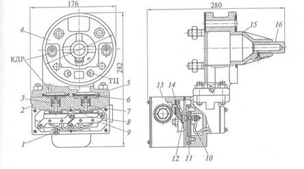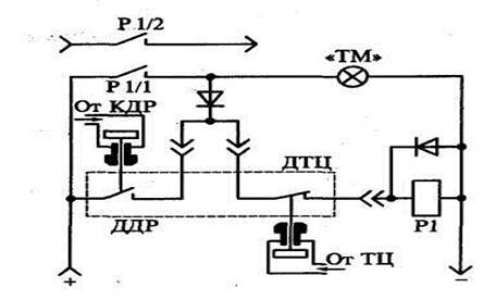 левой диафрагмы сигнализатора. При этом на катушку реле Р1 подается питание через замкнувшиеся контакты ДДР и замкнутые контакты ДТЦ правого микропереключателя. Сработавшее реле Р1 своим контактом Р1/1 замыкает цепь сигнальной лампы «ТМ» на пульте машиниста, а размыкающим контактом Р1/2 разбирает цепь управления тяговым режимом локомотива. После прекращения дополнительной разрядки давление в КДР падает, и контакты ДДР размыкаются. Однако катушка реле Р1 будет продолжать получать питание через свои замкнутые контакты Р1/1, диод и замкнутые контакты ДТЦ, т. е. сигнальная лампа «ТМ» на пульте будет продолжать гореть. При выполнении ступени торможения 0,6...0,7 кгс/см2 в ТЦ локомотива появляется скачок давления не менее 0,5 кгс/см2. Давлением из канала ТЦ правая диафрагма 5 сигнализатора, преодолев усилие пружины, переместит стержень-толкатель 7 вниз, и контакты ДТЦ правого микропереключателя размыкаются. Катушка реле Р1 теряет питание, сигнальная лампа «ТМ» гаснет, электрическая цепь управления тягой восстанавливается. При выполнении регулировочных торможений в пути следования сигнальная лампа загорается кратковременно и гаснет, что свидетельствует об исправной работе датчика.