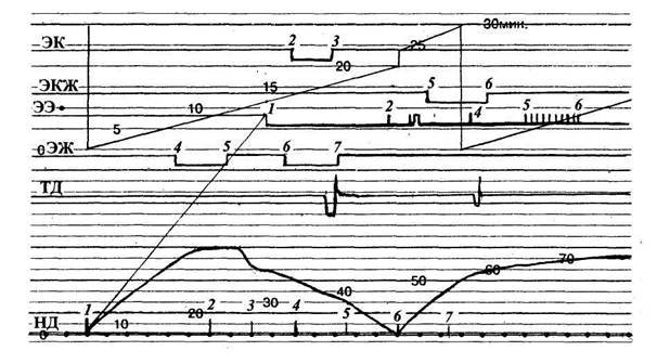 В точке 2 на ЛС внезапно появляется БО (в точке 2 на линии ЭК писец опустился вниз и, находясь в нижнем положении, записывает прямую линию). На свисток ЭПК машинист подтверждает бдительность (штрих 2 на линии ЭЭ), но не принимает мер к снижению скорости. Дальнейшую проверку бдительности по лампе предварительной сигнализации пропускает, подтверждая бдительность по свистку ЭПК нажатием «РБ» (следующий штрих по линии ЭЭ).