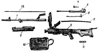 1 – ствол; 2 – ствольная коробка с крышкой, основанием приемника и прикладом; 3 – затворная рама с извлекателем и газовым поршнем; 4 – затвор; 5 – возвратно-боевая пружина; 6 – направляющий стержень; 7 – трубка газового поршня с сошкой; 10 – коробка с патронной лентой; 11 – принадлежность; 12 – шомпол.