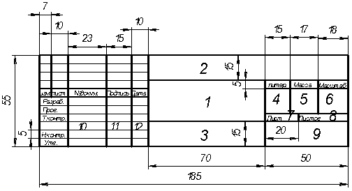 Формы и размеры основной надписи устанавливает ГОСТ 2.104-68. На чертежах деталей, сборочных чертежах, видов общих, схем основная надпись применяется по форме 1. Для таблиц, текстовой документации, спецификаций по форме 2 и 2а. На рисунке 3.1 представлена основная надпись по форме 1, разработанная на основе стандартной применительно к учебным целям. В графах основной надписи. указывают:
