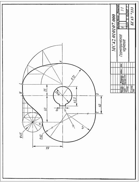 Построение очертания кулачка в каждом варианте следует начинать с нанесения осе координат Ох и Оу. Затем строят лекальные кривые по их заданным параметрам и выделяют их участки. Входящие в очертания кулачка. После этого можно вычертить плавные переходы между лекальными кривыми. При этом следует учесть, что во всех вариантах через точку Д проходит касательная к эллипсу, Обозначения Rх, показывает, что величина радиуса определяется построением. На чертеже вместо Rх надо проставить соответствующее число со знаком «*»