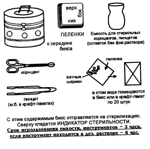 9. На ручку бикса прикрепить клеенчатую бирку. На бирке написать: номер отделения, дату, фамилию медсестры, наименование всего материала, находящегося в биксе послойно.