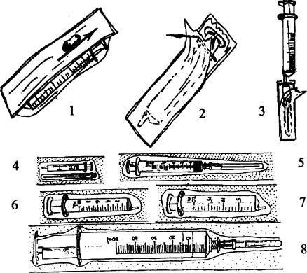 Обработать бумажную сторону упаковки ватным шариком, смоченным в спирте, если вместе с цилиндром лежит игла муфтой к рукоятке шприца (см. рис №4.).