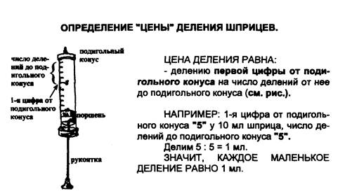 Прежде, чем начать работу, медсестра ОБЯЗАНА научиться рассчитать ЦЕНУ ДЕЛЕНИЯ различных объемов шприцев (см. выше).