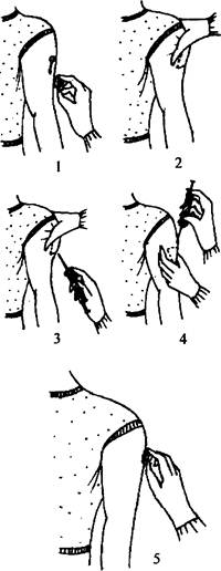 2. ОБРАБАТЫВАЕТ ПЕРЧАТКИ шариком, смоченным спиртом. В ПРАВУЮ руку берет ШПРИЦ, ЛЕВОЙ - захватывает в складку среднюю треть ЗАДНЕЙ поверхности плеча так, чтобы образовался "V" основанием вниз или вверх (см. 2, 3, 4).