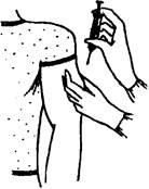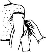 МЕДСЕСТРА ОБРАБАТЫВАЕТ ПЕРЧАТКИ ШАРИКАМИ, СМОЧЕННЫМИ СПИРТОМ, ЛЕВОЙ РУКОЙ ЗАХВАТЫВАЕТ В НАПРАВЛЕНИИ СВЕРХУ ВНИЗ МЕСТО ИНЪЕКЦИИ ТАКИМ ОБРАЗОМ, ЧТОБЫ ОБРАЗОВАЛАСЬ СКЛАДКА В ВИДЕ ТРЕУГОЛЬНИКА (см. рис.).В ПРАВУЮ РУКУ берет ШПРИЦ И ПОД УГЛОМ 30-45 градусов ВВОДИТ ИГЛУ в ОСНОВАНИЕ ТРЕУГОЛЬНИКА.