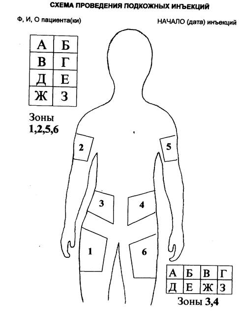 При введении инсулина ПОСТОЯННО места для подкожных инъекций разбиваются на зоны, всего зон - 30. По определенному графику введения инсулина используют эти зоны.