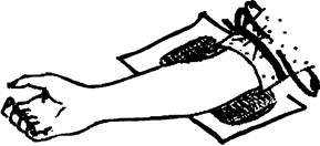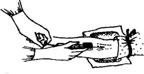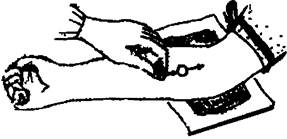 1 ЭТАП. Медсестра осматривает возможное место венепункции. Накладывает эластичный венозный жгут на среднюю треть плеча (НЕ НА ГОЛОЕ ТЕЛО), в направлении СВЕРХУ ВНИЗ так, чтобы петля узла была расположена на стороне БОЛЬШОГО пальца, предварительно подложив под локтевой сгиб клеенчатый валик, на него ПЛАСТИПАТ.