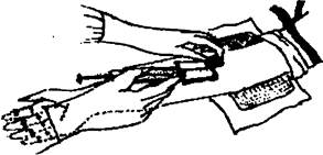 3 ЭТАП. МЕДСЕСТРА В ПРАВУЮ РУКУ берет ШПРИЦ, фиксируя иглу УКАЗАТЕЛЬНЫМ паль. цем (особенно, если это шприц многоразового использования!), 4 пальца ЛЕВОЙ РУКИ подводит под ЗАДНЮЮ поверхность предплечья, а БОЛЬШИМ пальцем этой руки СЛЕГКА НАТЯГИВАЕТ кожу над пунктируемой веной, тем самым ее фиксируя.