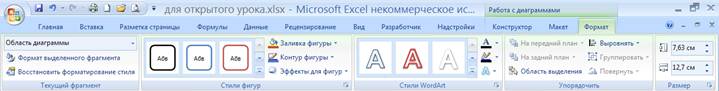 Любые элементы диаграммы могут быть отформатированы. Для этого используются команды вкладки Формат. Также можно отформатировать любой элемент диаграммы, вызвав на нем правой кнопкой мыши контекстное меню.