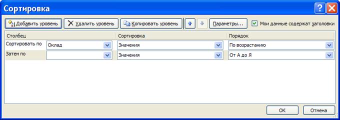 Здесь можно добавить еще уровни сортировки, нажав на кнопку Добавить уровень. Уровни можно перемещать вверх и вниз, изменяя таким образом их приоритет. Для перемещения выделяете уровень, и нажимаете на иконку с изображением стрелки вверх или вниз. Также уровни сортировки данных можно копировать и удалять.
