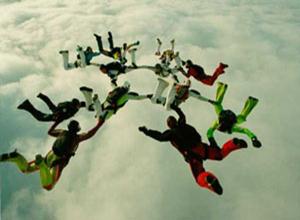 Так или иначе все разновидности парашютного спорта связаны со свободным падением и планированием (снижением и приземлением) под куполом парашюта. На этой фотографии группа парашютистов находится в свободном падении: