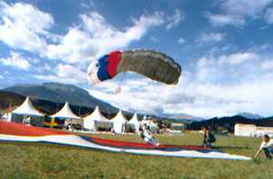 Скорость падения достигает 50-60+ метров в секунду или 180-200+ километров в час. Благодаря этой скорости парашютист может свободно передвигаться в воздухе, используя при этом свое тело (руки, ноги и т.д.) как рули. В свободном падении парашютист находится довольно мало времени. При прыжке с 4000 тысяч метров всего 60 секунд. Чтобы благополучно приземлиться парашютисту нужен парашют, который затормозит эту скорость и доставит его на землю, в нужное ему место. На этом фото вы видите приземление на современном парашюте: