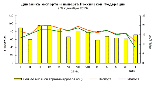 Сальдо торгового баланса в январе 2015г. сложилось положительное, 15,0 млрд.долларов (в январе 2014г. - положительное, 18,7 млрд.долларов).