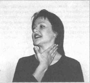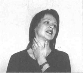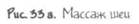 Поверните голову направо. Ладонью правой руки круговыми движениями снизу вверх и немного в сторону массируете левую сторону шеи. Затем поворачиваете голову налево и ладонью левой руки массируете правую сторону шеи (см. рис. 33 а).