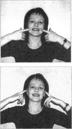 Указательными пальцами маленькими круговыми движениями массируете щеки, начиная от уголков губ до середины ушей (см. рис. 35 а).