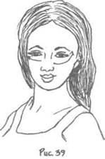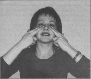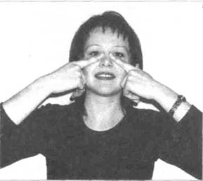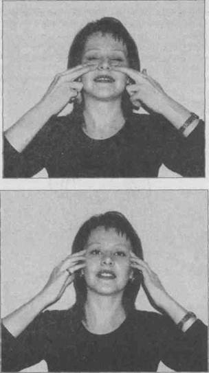 Очень мягко (не круговыми движениями) средним и указательным пальцами массируете верхнюю часть щек, начиная от крыльев носа до висков (см. рис. 39 а).