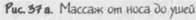 Мягко, мелкими круговыми движениями массируете указательным и средним пальцами, начиная от крыльев носа до кончиков ушей (см. рис. 37 а).