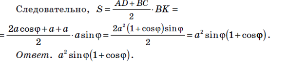 7. В равнобедренной трапеции меньшее основание a равно боковой стороне, а острый угол равен φ. Найдите площадь трапеции.
