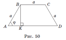 Пусть в трапеции ABCD BC = AB = CD = a, ∠ BAD = ∠ ADC = φ (рис. 50).