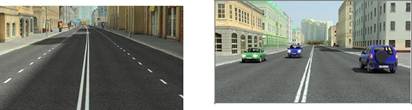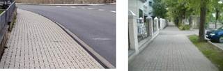 На левом рисунке видим пример, когда тротуар сразу граничит с проезжей частью, он отделен от нее бордюрным камнем (поребриком) и приподнят по отношению к проезжей части. На правом тротуар отделен от проезжей части газоном.