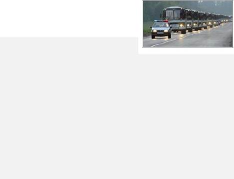 транспортных средств, следующих непосредственно друг за другом по одной и той же полосе движения с постоянно включенными фарами в сопровождении головного транспортного средства с нанесенными на наружные поверхности специальными цветографическими